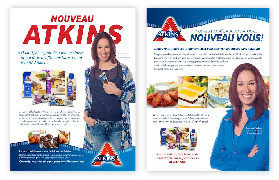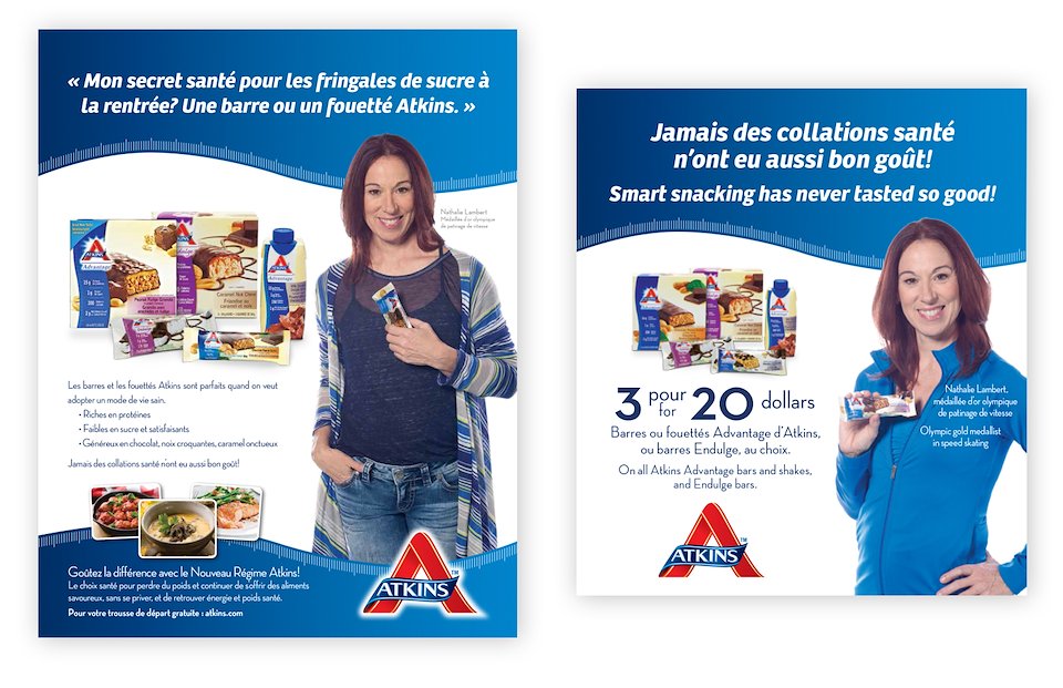 French language campaign re-introducing the Atkins snack portfolio to Quebecers. Homegrown hero and Olympic Champion Nathalie Lambert was engaged as the face of Atkins smart snacking. The effort resulted in a sales lift that exceeded targets and helped secure additional distribution.